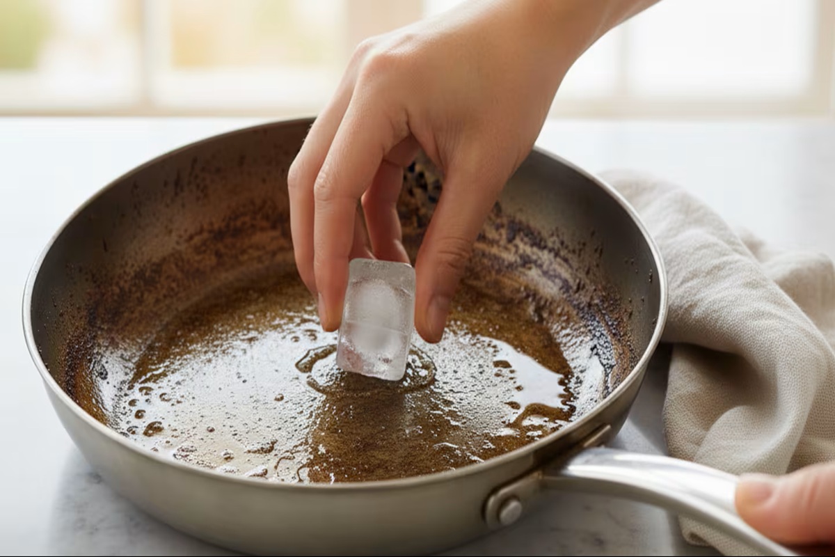 - For stubborn stains, add a little coarse salt along with the ice: the texture helps remove grease without damaging the pan.